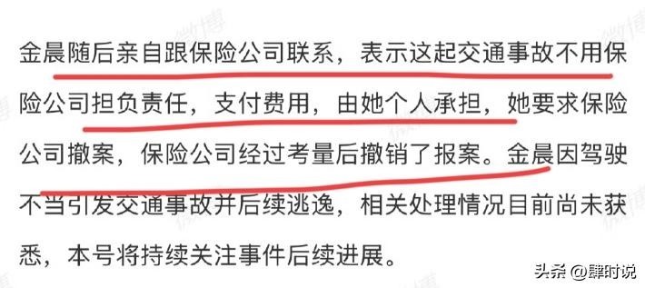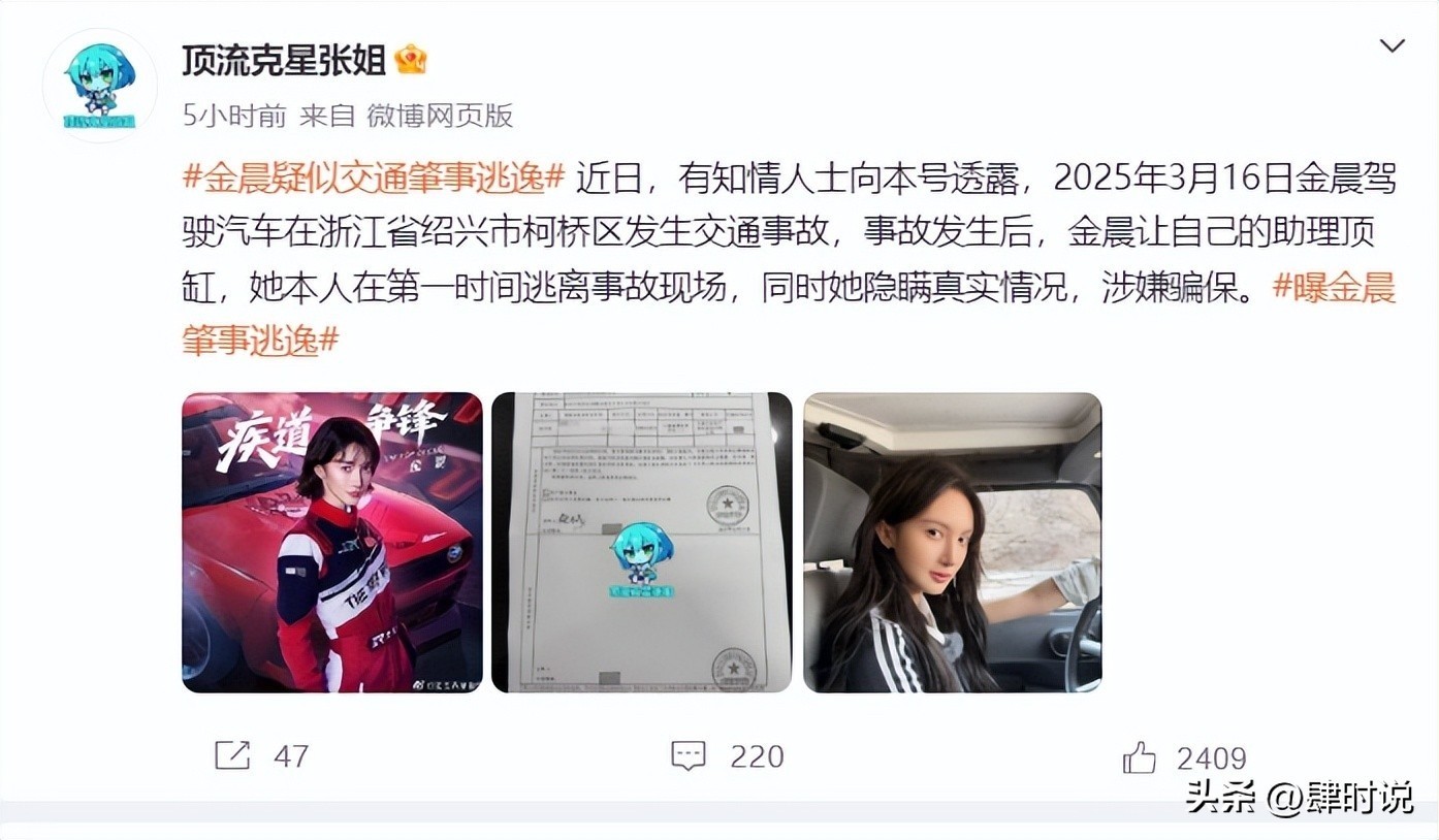 金晨意外被翻出去年底的一桩旧案——驾驶车辆发生碰撞后离场、由助理代为认责、后续还牵涉保险欺诈嫌疑。