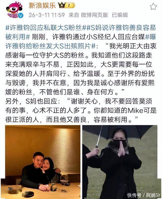 小S第一时间让经纪人出来力挺老公,S妈也跟着帮腔,说许雅钧:很正派、很善良,是被人利用了。
