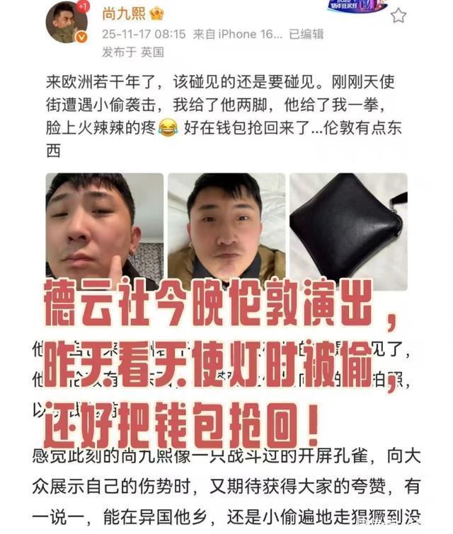 被当众抢劫 很多曾在国外旅游过的网友,可能都经历过国外治安混乱的问题,没想到这次连德云社的成员都没逃过。 尚九熙这次,就狠狠踩了雷,他11月17日在英国发布了一个博文,透露自己遭到抢劫的经历。