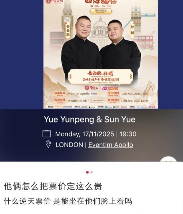 林轻吟 编辑| 林轻吟 前言 这段时间,要说内娱最忙的人估计就是岳云鹏了,前面还在轰轰烈烈的办巡回演唱会,这边就又跑到了伦敦讲相声。 他和一众德云社的同事们,一起去英国进行巡演,却不曾想意外状况频发,吐槽的声音层出不穷。 难道岳云鹏这段时间在演唱会上积攒的人气又要消失殆尽了?