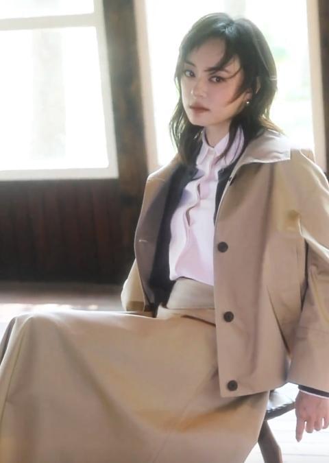 只见她穿着一件浅色衬衫,叠搭了一件黑色开衫,外面穿着卡其色外套。