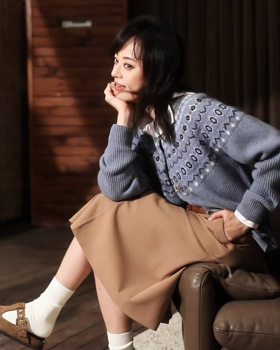 下身是驼色长裙,脚下踩着一双棕色平底鞋,黑色的裤袜换成了白色中筒袜,多了一种青春感。