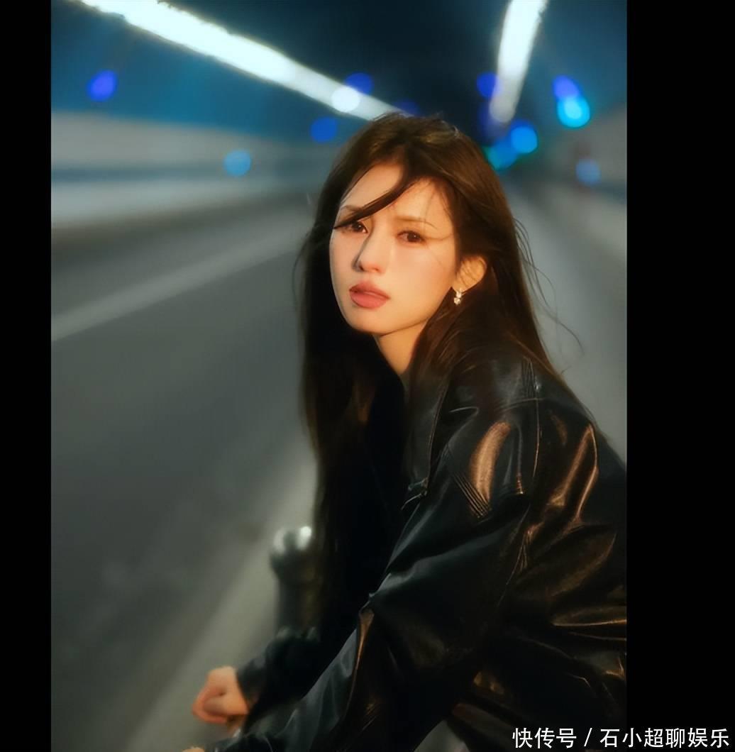 鹤男长发飞扬,氛围感拉满,披着皮衣,注视镜头,眼神充满故事,黑衣搭配粉裙,超级亮眼。锁骨线条十分吸睛,好似文艺片的女主角,公主风回眸好动人,笑容明媚,散发生命力。
